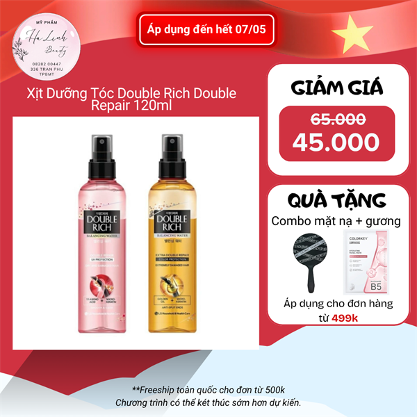 Nước xịt dưỡng tóc Double Rich Double Repair 250ml là dòng nước dưỡng chăm sóc tóc đến từ thương hiệu mỹ phẩm Double Rich thuộc tập đoàn LG của Hàn Quốc, thành phần bổ sung protein và vitamin dồi dào nuôi dưỡng tóc chắc khỏe, ẩm mượt, phục hồi và cân bằng độ ẩm cho tóc suôn mượt. Sản phẩm để lại hương thơm nhẹ nhàng, thư giãn, thoải mái.